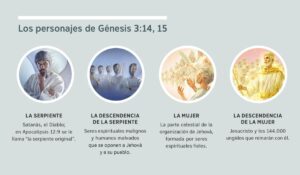 Serie de imágenes: “Los personajes de Génesis 3:14, 15”. 1. La serpiente: Satanás, representado como un ser espiritual. 2. La descendencia de la serpiente: seres espirituales malignos. 3. La mujer: seres espirituales fieles. 4. La descendencia de la mujer: Jesucristo y los que reinarán con él en su gloria celestial. Las imágenes se repiten en los párrafos 4, 5, 7, 8 y 9.