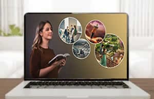 Una hermana lee algunas profecías bíblicas y medita en ellas. Serie de imágenes: 1. Un matrimonio predica con el carrito y habla con un hombre. 2. Un padre y su hijo observan los daños causados por un desastre natural. 3. Una piedra golpea los pies de la estatua del sueño de Nabucodonosor, que se describe en el capítulo 2 de Daniel. 4. Un grupo de personas felices en el Paraíso.
