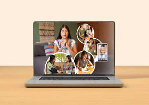 Serie de imágenes: 1. Una hermana orando. 2. Escuchando mientras otra hermana se desahoga. 3. Hablando por videoconferencia con una hermana mayor que está enferma. 3. Escribiendo una nota que le va a enviar a alguien con un regalo. 4. Comiendo con una hermana que tiene un brazo inmovilizado por una lesión. ¿Cómo podemos ayudar a un hermano o una hermana que está sufriendo? (Vea los párrafos 7 a 9).