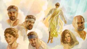 Y el imagen podemos ver algunos de ellos también para el párrafo 15 esta imagen nos dice que ahí está Tomás el que le dijo a Jesús si no veo no creo ahora está en los cielos y ahora con una fe bien fortalecida y ayudando a Jesucristo, Santiago y Juan que le pidieron un lado en su reino ahora se van a confirmar y muy contentos de estar en el reino y mujeres fieles como Lidia y María y el mismo apóstol Pablo del que estamos hablando hoy, cuán feliz está ahorita en los cielos junto a Jesucristo.