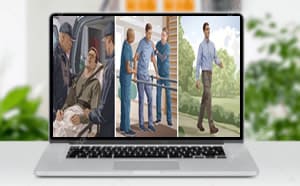 Imágenes de un hermano herido que se recupera con el tiempo. 1. Los paramédicos se lo llevan en una ambulancia. 2. Recibe terapia física para volver a caminar. 3. Camina erguido y seguro.