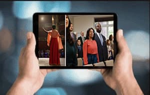 Imágenes que representan la decisión que tomó Julia. 1. Está cantando en un escenario delante de mucha gente. 2. Está cantando con su esposo en una reunión en el Salón del Reino.