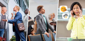 Serie de imágenes: 1. En la predicación, un hermano le habla con dureza a un hombre que está enojado. 2. Un hermano joven no se atreve a cantar en una reunión de congregación. 3. Una hermana habla por teléfono. Los emoticonos de una cara que echa fuego por la boca y de una nube con relámpagos y lluvia representan palabras hirientes o negativas.