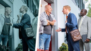 Serie de imágenes que muestran dos escenas diferentes en la predicación: 1. La imagen de antes del hermano que le habla con dureza a un hombre que está enojado. 2. El hermano le habla de forma amable al hombre que está enojado.