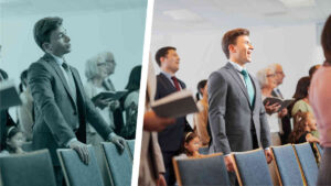 Serie de imágenes que muestran dos escenas diferentes en una reunión de congregación. 1. La imagen de antes del hermano joven que no se atreve a cantar en la reunión. 2. El hermano joven canta con entusiasmo.