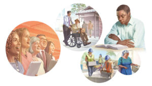 Imágenes que muestran diferentes aspectos de la adoración verdadera. 1. Varios hermanos cantan en una reunión de congregación. 2. Un hermano empuja la silla de ruedas en la que va un hermano mayor mientras predican juntos. 3. Un hermano hace una oración antes de leer la Biblia. 4. Una hermana echa una donación en una caja de contribuciones. 5. Dos hermanas y un hermano trabajan en la construcción de unas instalaciones teocráticas.