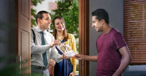 Un matrimonio le ofrece el folleto “Disfrute de la vida” a un hombre en su hogar.