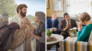 Serie de imágenes: 1. Jesús llora junto con María, Marta y otras personas. 2. Dos ancianos consuelan a una hermana que ha sufrido la muerte de un familiar.