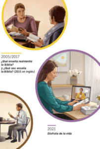 Serie de imágenes: Publicaciones que se han usado a lo largo de las décadas para ayudar a las personas a aprender de la Biblia. 1. 1949: “Sea Dios veraz”. Una hermana le predica a un matrimonio y les ofrece el libro. 2. 1968: “La verdad que lleva a vida eterna”. Un hombre lee el libro en su casa. 3. 1982: “Usted puede vivir para siempre en el paraíso en la Tierra”. Un hermano le da clases de la Biblia a un hombre. 4. 1995: “El conocimiento que lleva a vida eterna”. Un hermano le da clases de la Biblia a un compañero durante la pausa del almuerzo en su lugar de empleo. 5. 2005 y 2017: Los libros “¿Qué enseña realmente la Biblia?” y “¿Qué nos enseña la Biblia?”. Una hermana le da clases de la Biblia a una mujer. 6. 2021: “Disfrute de la vida”. Una hermana le da clases de la Biblia a una mujer por videoconferencia.