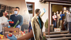 Serie de imágenes: 1. Unos hermanos preparan cajas de comida en una despensa. 2. Un hermano entrega una de las cajas a una familia.