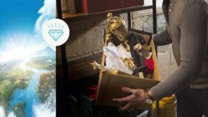 Serie de imágenes: Un diamante dentro de un círculo. 1. Un paisaje paradisiaco en el que se ven montañas, valles llenos de vegetación y un río. 2. Un hombre se deshace de una caja llena de trofeos y premios.