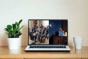 Serie de imágenes: 1. Un anciano da una sugerencia en una reunion de ancianos, pero los demás no están de acuerdo con ella. 2. Luego, el anciano que dio la sugerencia medita mientras mira el cielo estrellado.