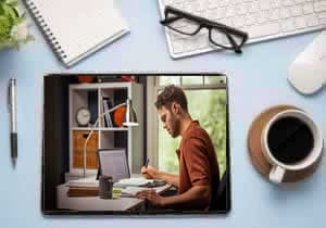 Un hermano joven está haciendo su estudio personal con la Biblia, una tableta y un cuaderno, y está anotando algo en la Biblia.