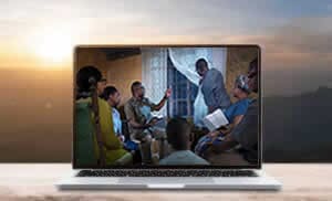 Durante la gran tribulación, varios hermanos leen la Biblia juntos en una habitación por la noche. Miran por la ventana, y uno de ellos señala al cielo.