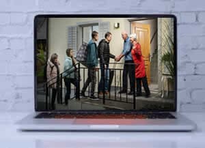 Un matrimonio mayor recibe con cariño en su casa a una familia de hermanos que ha tenido que dejar su hogar. La familia lleva una sola maleta y unas pocas bolsas.