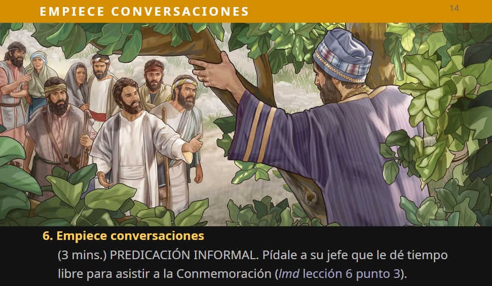 Empiece conversaciones (3 mins.) PREDICACIÓN INFORMAL. Pídale a su jefe que le dé tiempo libre para asistir a la Conmemoración (lmd lección 6 punto 3).