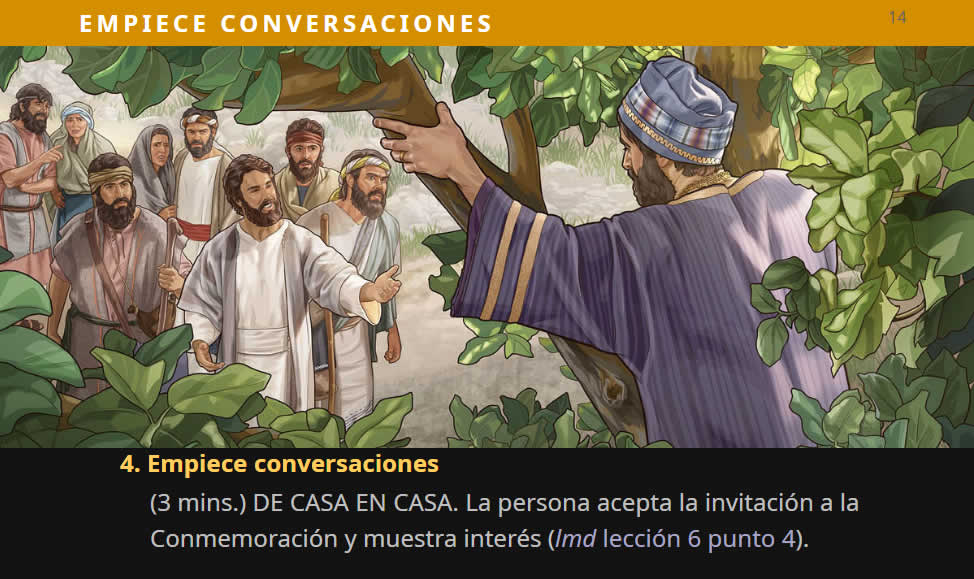 Empiece conversaciones (3 mins.) DE CASA EN CASA. La persona acepta la invitación a la Conmemoración y muestra interés (lmd lección 6 punto 4).