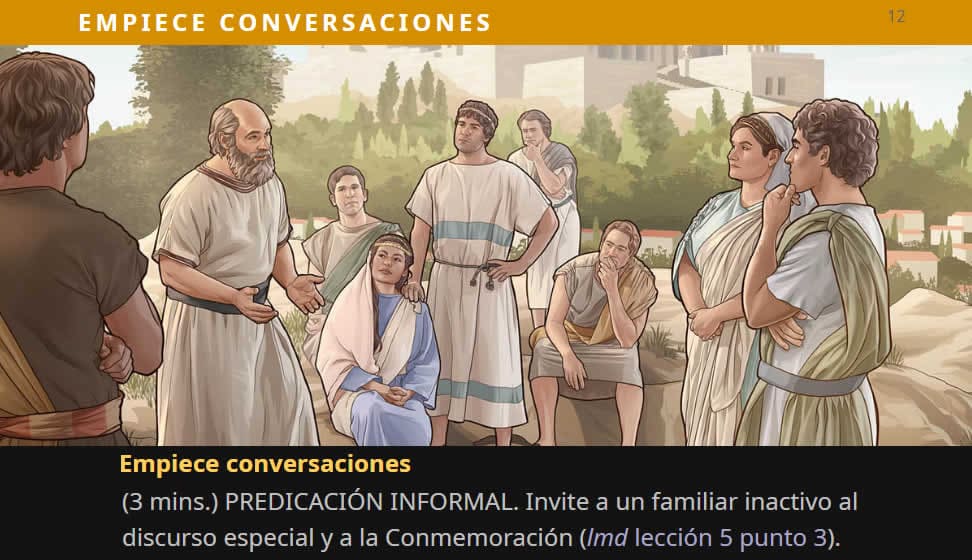 Empiece conversaciones (3 mins.) PREDICACIÓN INFORMAL. Invite a un familiar inactivo al discurso especial y a la Conmemoración (lmd lección 5 punto 3).