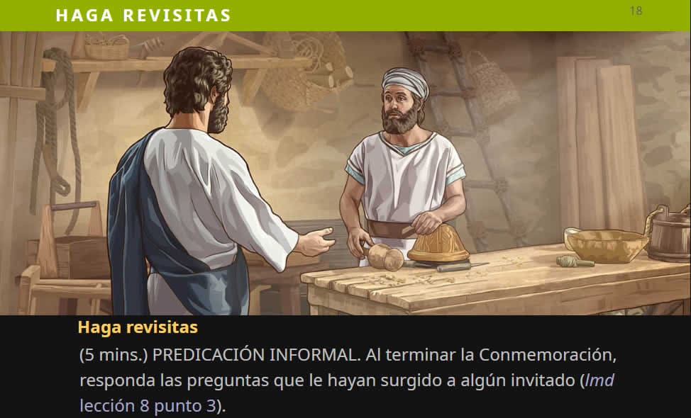 Haga revisitas (5 mins.) PREDICACIÓN INFORMAL. Al terminar la Conmemoración, responda las preguntas que le hayan surgido a algún invitado (lmd lección 8 punto 3).