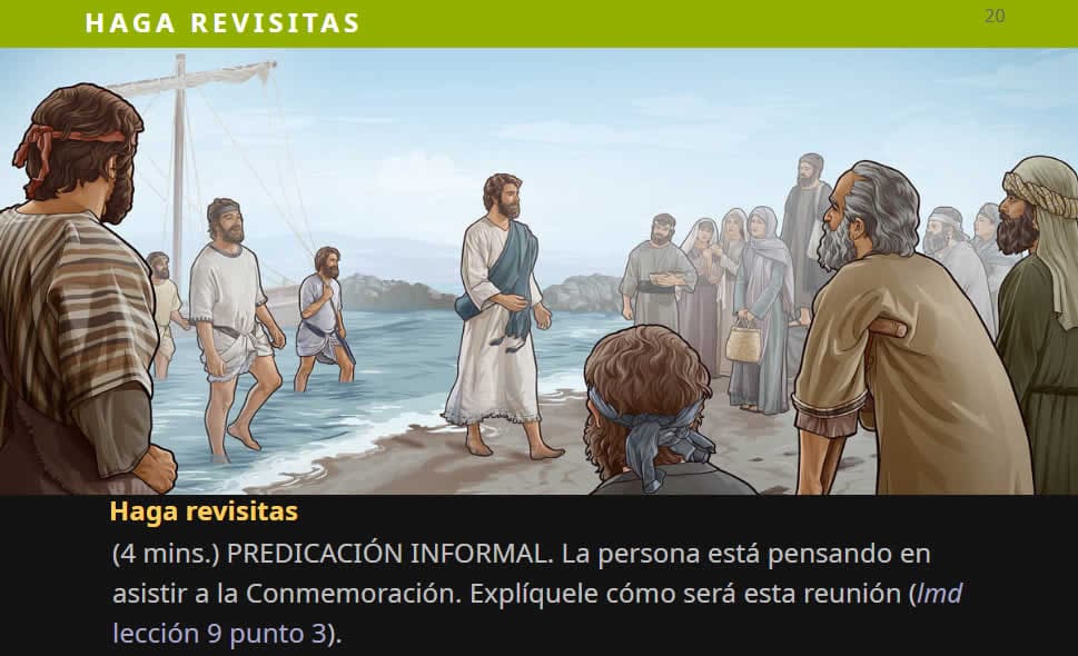 Haga revisitas (4 mins.) PREDICACIÓN INFORMAL. La persona está pensando en asistir a la Conmemoración. Explíquele cómo será esta reunión (lmd lección 9 punto 3).