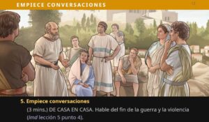 Empiece conversaciones (3 mins.) DE CASA EN CASA. Hable del fin de la guerra y la violencia (lmd lección 5 punto 4).