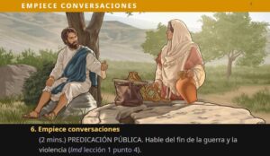 Empiece conversaciones (2 mins.) PREDICACIÓN PÚBLICA. Hable del fin de la guerra y la violencia (lmd lección 1 punto 4).