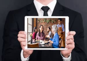 La fotografía que ilustra nuestra guía de actividades muestra a un grupo de personas compartiendo en un ambiente relajado, disfrutando de alimentos y conversación. Se ve a una mujer de mayor edad hablando con una mujer más joven, mientras otras dos personas —un hombre y otra mujer— interactúan en un segundo plano. También se aprecia a un mesero atento a su labor. Esta escena transmite un clima de armonía y respeto mutuo.