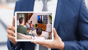 La ilustración de nuestra guía de actividades presenta a una familia completa sentada en la sala de su hogar, siguiendo con atención un programa de Broadcasting en la pantalla del televisor. El padre sostiene una tableta con material de apoyo. La madre y la hija mayor miran con respeto al orador, mientras la hija menor, con un dispositivo móvil, también participa a su manera. La imagen ilustra a la perfección el mensaje del discurso.