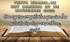TEXTO DIARIO, Domingo 27 de noviembre 2022, Una esposa competente supervisa las actividades de su casa (Prov. 31:27).